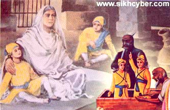 She woke them up early the next morning and readying them for the ensuing test they were going to be put to at the court of Wazir Khan,the tyrant ruler of Sirhind. She thus said to them, “O sons of great Guru Gobind Singh ! you are going to be offered all the comforts of a luxurious life if you agree to say goodbye to your religion and adopt Islam as your new religion.If you refuse to accept such an attractive offer they will threaten you with painful deaths. I have full confidence that though you are young Kids,you will neither be fooled by the attractive offers nor be seduced by their threats. Be brave like your Guru father who has put every thing including his life at stake to prepare people to uproot the rule of tyrant rulers. Keep up the honour of your father at all costs.”