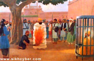Facing his master Sri Guru Teg Bahadur Sahib and while reciting Gurbani and meditating, Bhai Sati Dass who was wrapped in cotton, was set afire and burnt alive under the watchful eyes of his Guru and thousands of spectators. While many of spectators were sobbing, some Muslims were deriving pleasure out of these most barberous acts of execution exployed by their co-religionist rulers. Sri Guru Teg Bahadur Sahib, sitting in the cage showered his blessings on his three Sikhs who had faced brutal executions with unflinching faith and courage. He was immensly pleased with the steadfastness shown by these three Sikhs which was sure to inspire many more Sikhs to emulate the examples of these brave Sikh martyrs.
