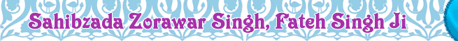 Thus the two sons of Guru Gobind Singh, aged 6 & 8 years respectively, became the youngest martyrs at the hands of barbarous rulers. Their brave deeds will provide inspiration to the Sikhs and their young children to emulate the brave acts of young Sahibzadas of the tenth master whom no amount of wordly attractions and threat could deter from their resolve to stick to their faith and fight against the unjust and cruel rulers. Mata Gujri ji also provided a shining example to all mothers and grandmothers as to how they should imbibe good qualities of religion, sacrifice, faith, in the young minds of their sons and grandsons at tender age, and prepare their minds and bodies to facce challenges they are likely to face as they grow up. The example of Mata Gujri Ji is worth emulating by all mothers and grandmothers. |